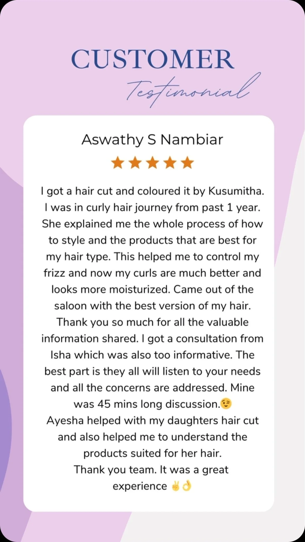 “They are simply the best when it comes to curly hair. Not only do they do wonders in the studio, they guide you on how well you can take care of the curls by demonstration!